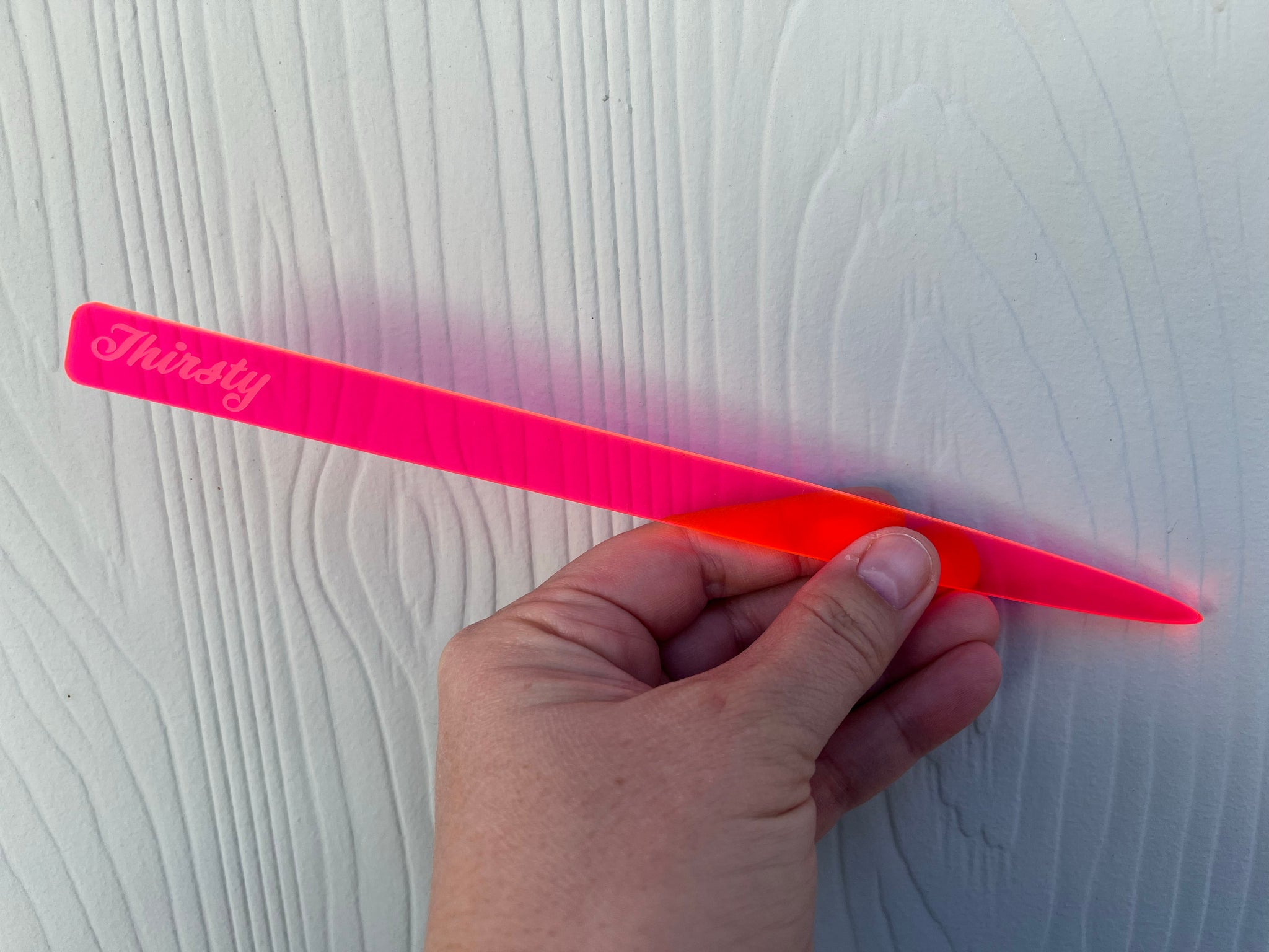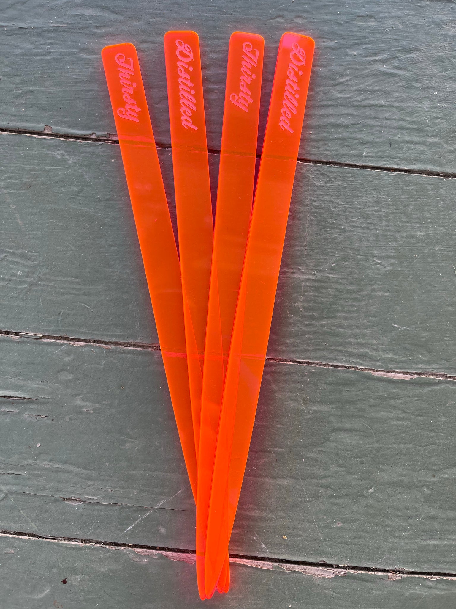 deer sara teamed up with Joy Corps to create these four plant markers laser etched on glowing hot pink/orange acrylic. In this set of four, two say Distilled, and the other two say Thirsty to give you and your plant sitters helpful watering and plant care instructions.