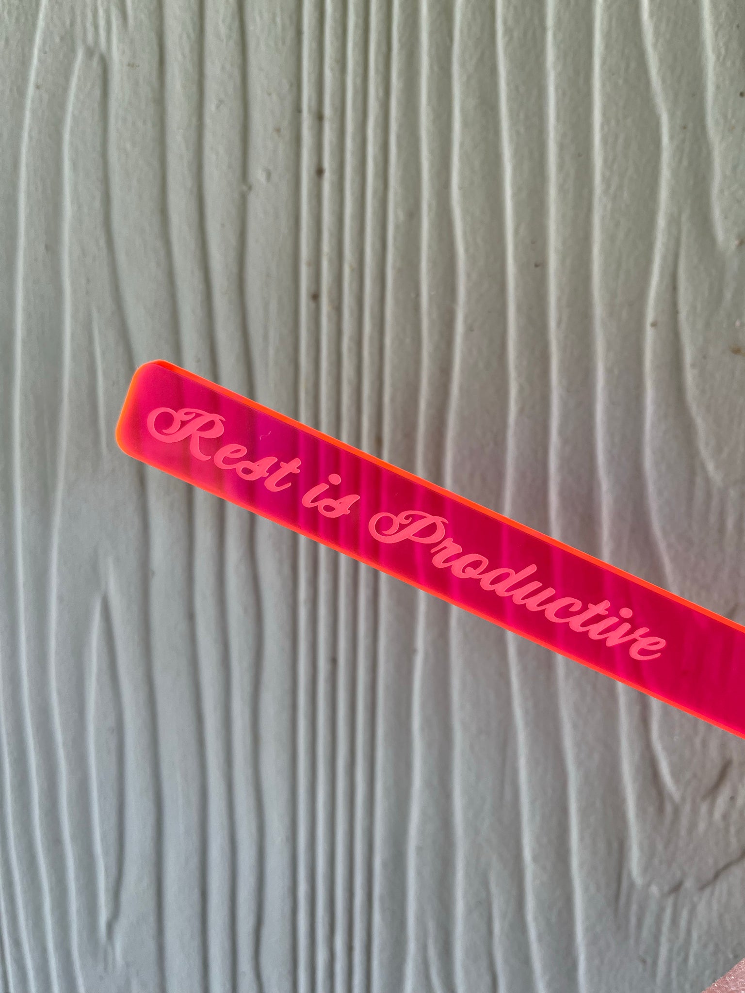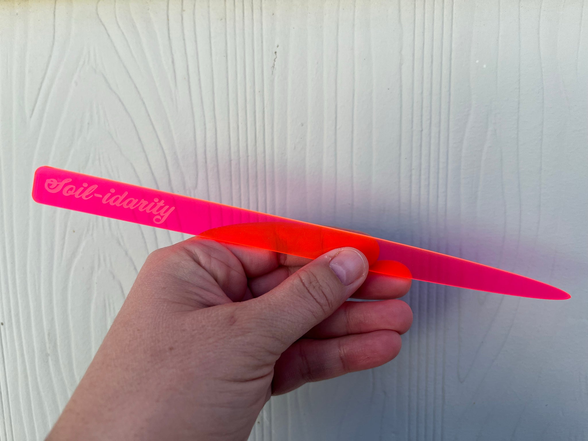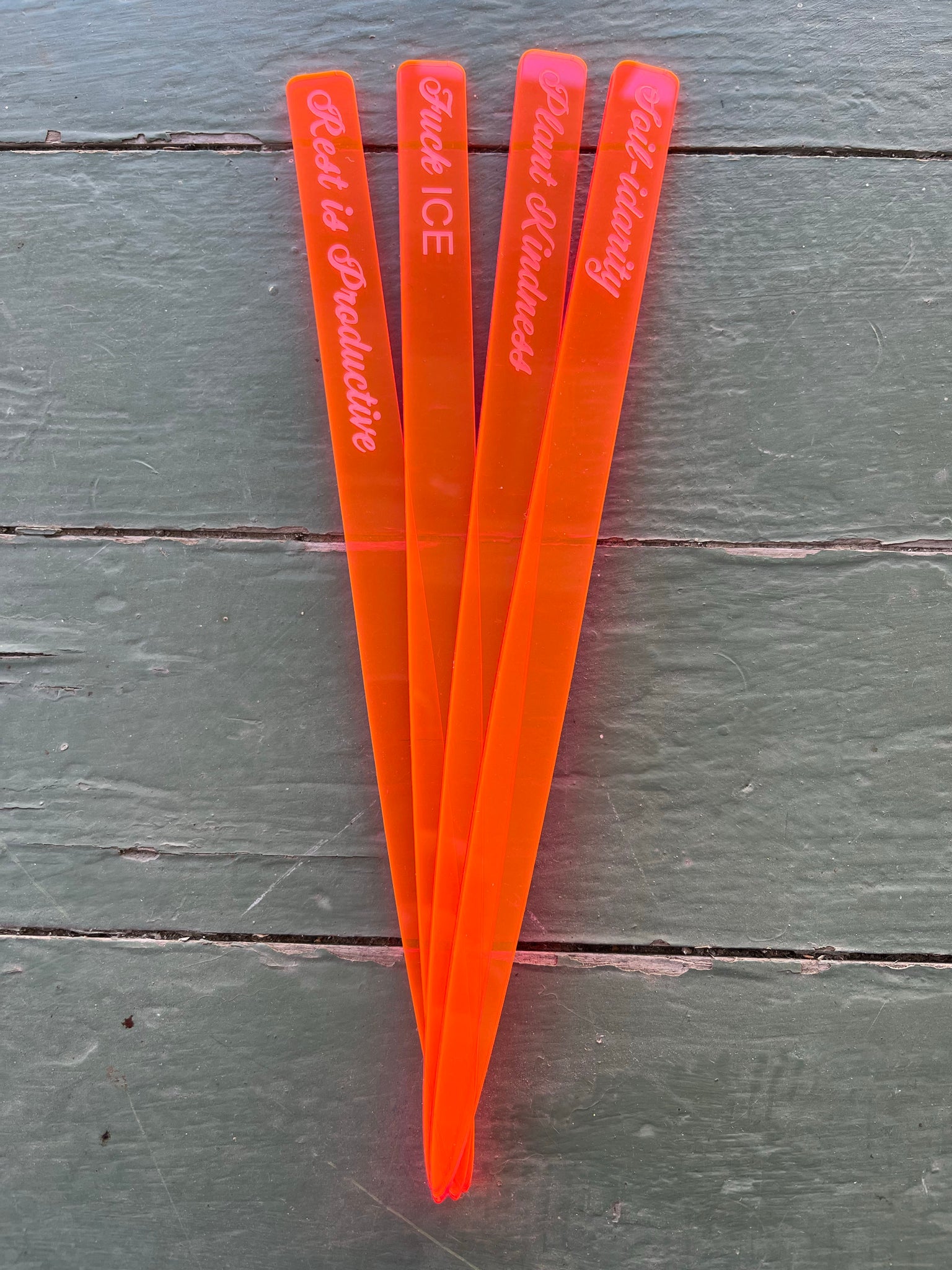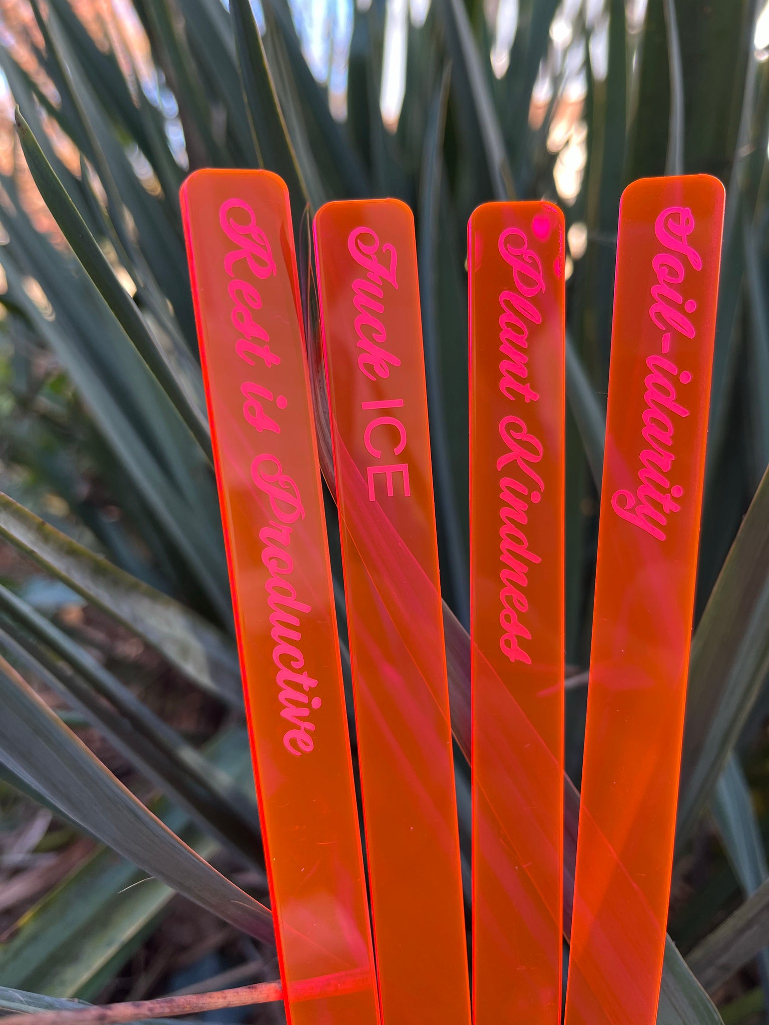 deer sara teamed up with Joy Corps to create this set of four plant markers laser etched on glowing hot pink/orange acrylic that say Rest is Productive, Plant Kindness, Soil-idarity, Fuck ICE.
