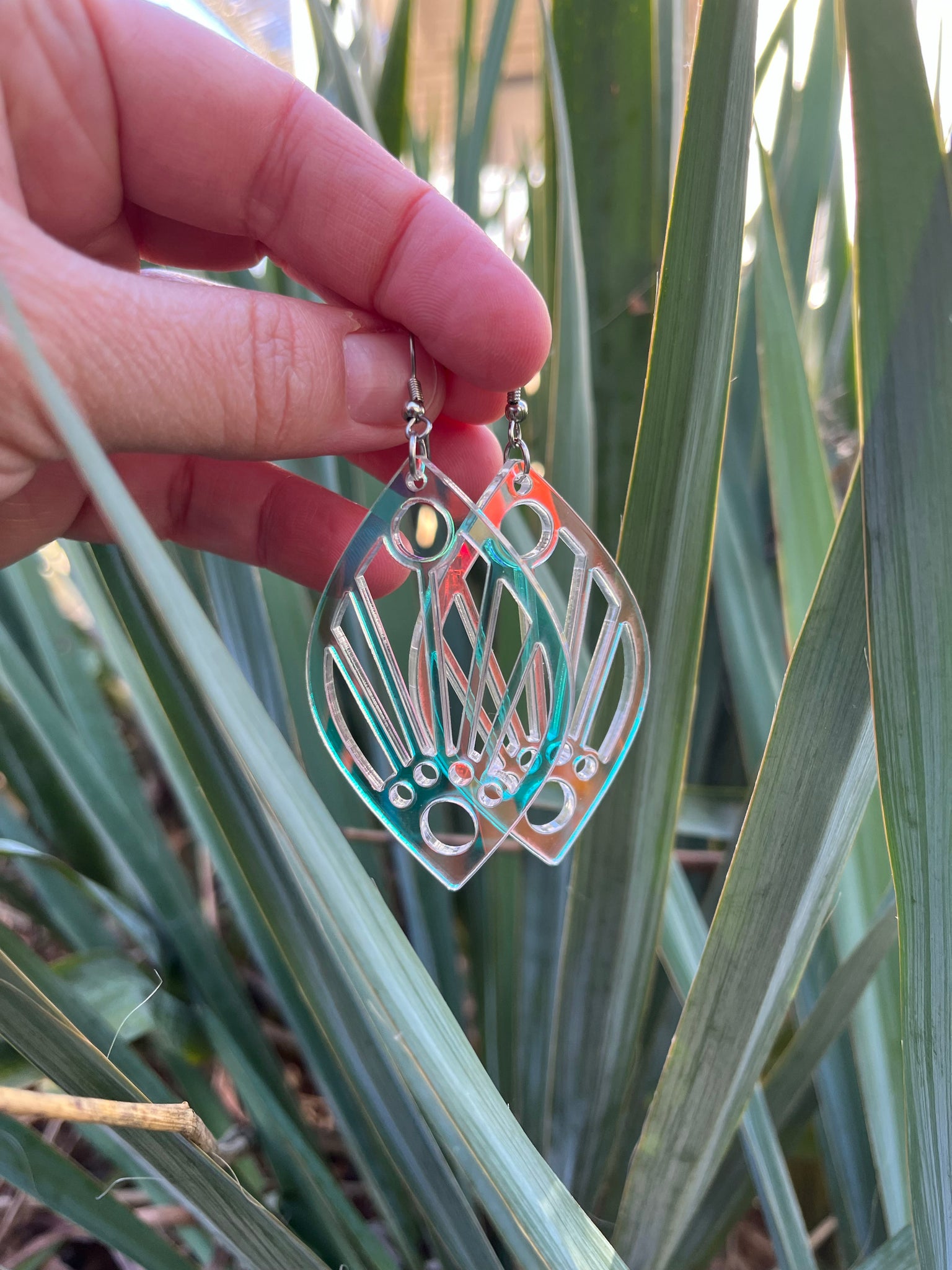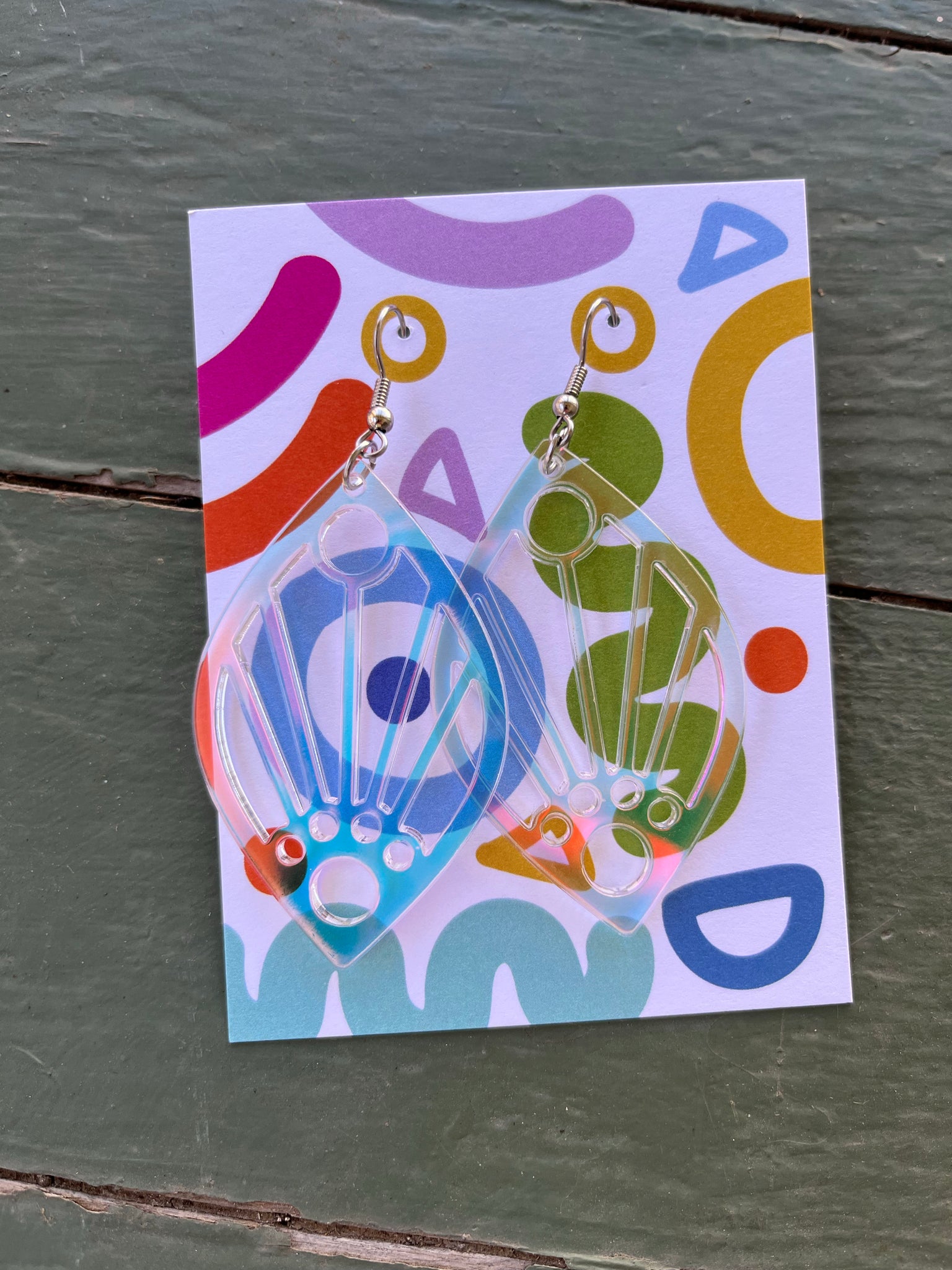 deer sara teamed up with Joy Corps for these exclusive art deco sunrise design earrings, laser cut and laser etched in iridescent acrylic, large.